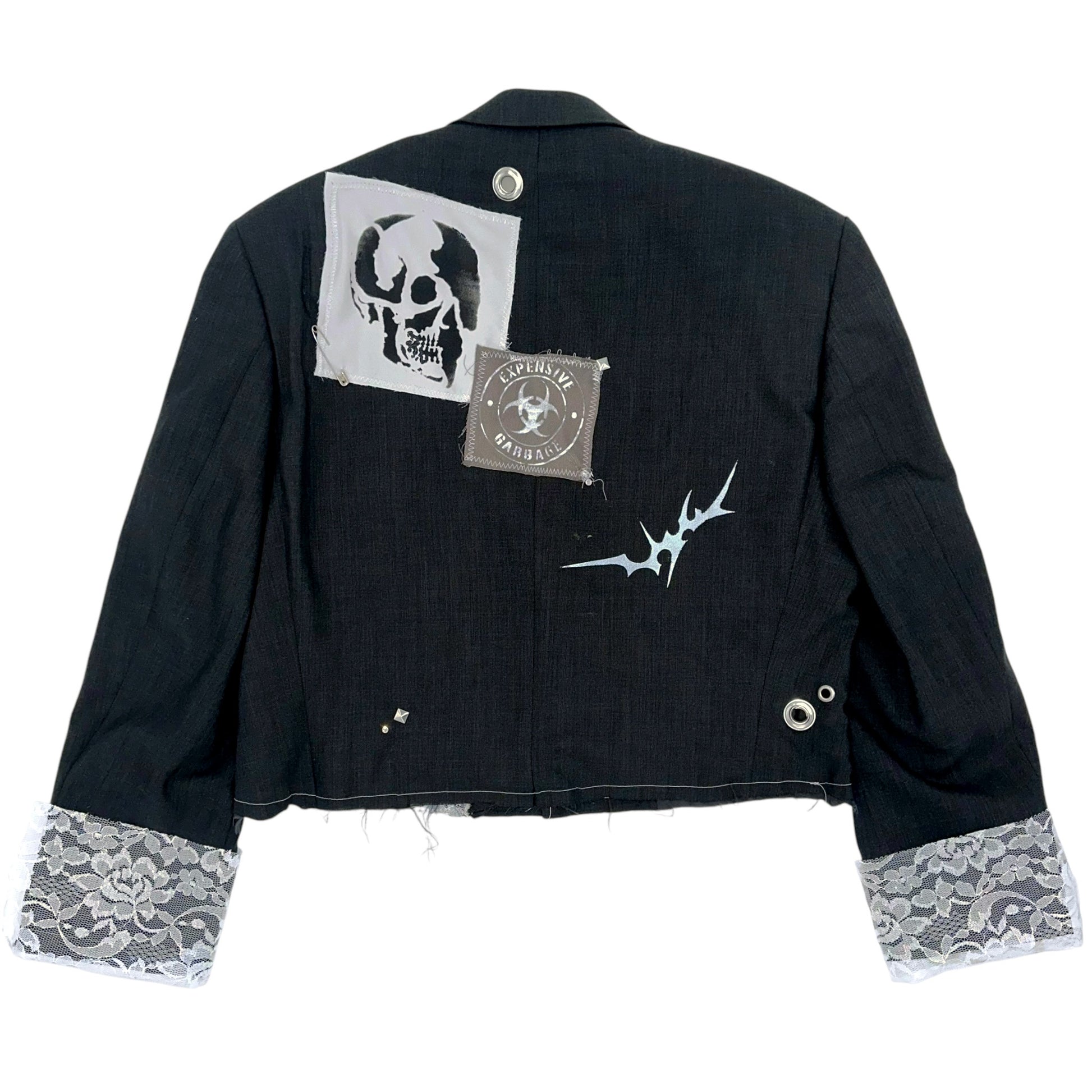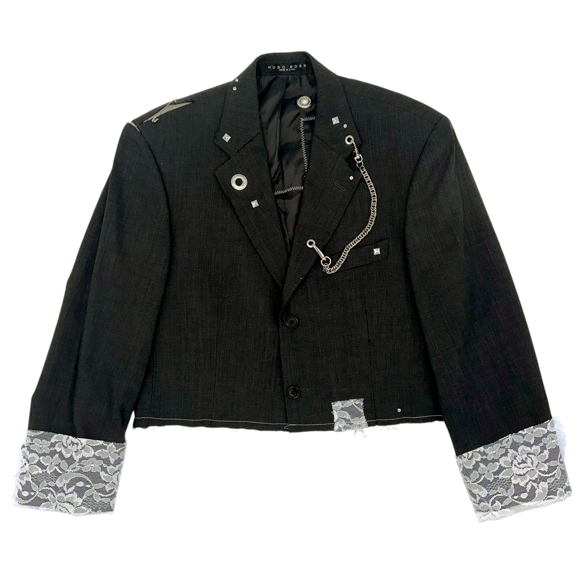 - Features raw edges, lace detailing, patches & metal chain / hardware details
